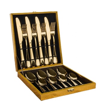 Cubiertos chapados en oro Royal Titanium al por mayor, juego de cubiertos chapados en oro de 16 piezas al por mayor con caja de madera para regalo de fiesta de boda